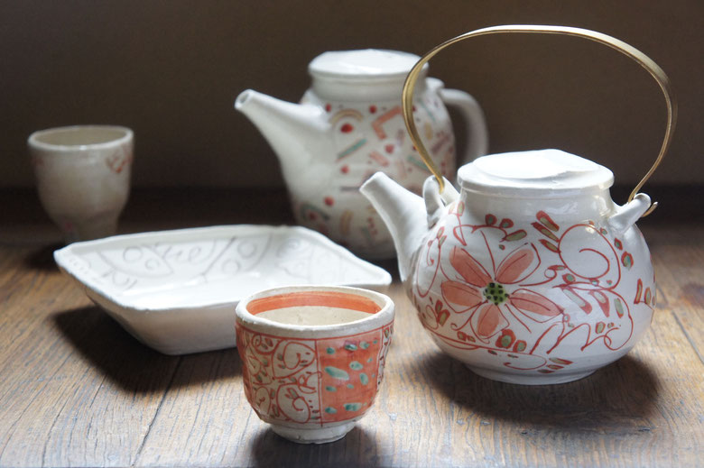 数々のポットも、モダンな色絵で食卓を彩ります。