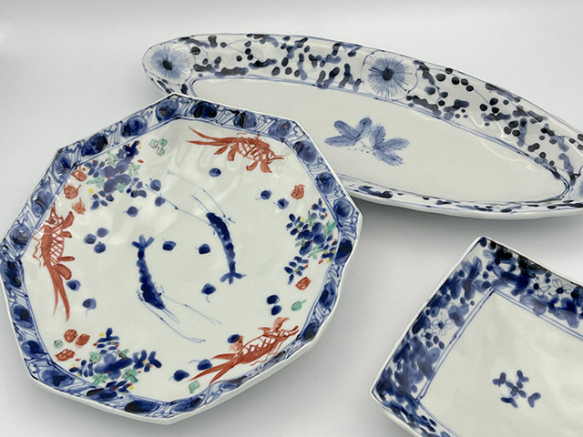 色絵で古典的な絵柄を現代的に大胆にアレンジ、またドット模様などモダンな絵柄を自由自在に器に表現されています。
